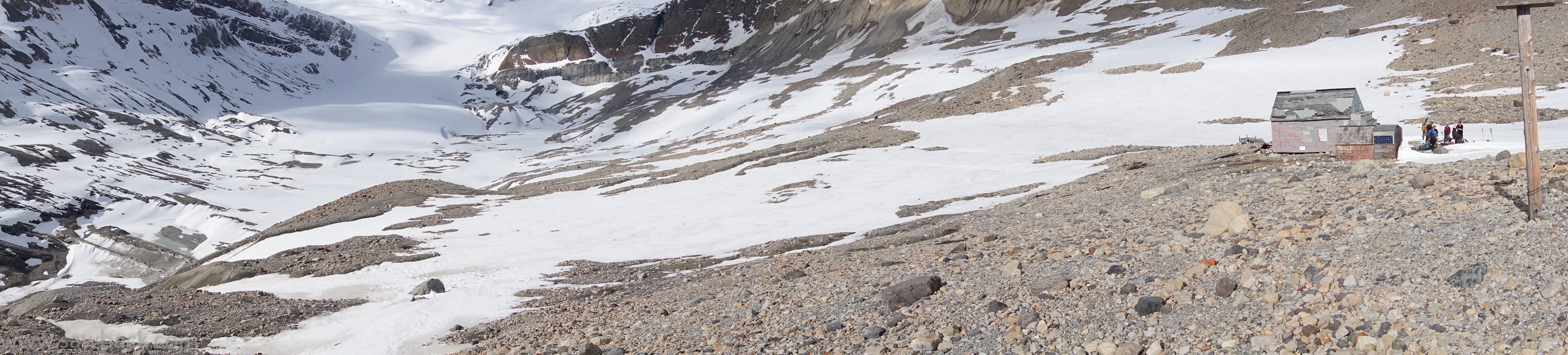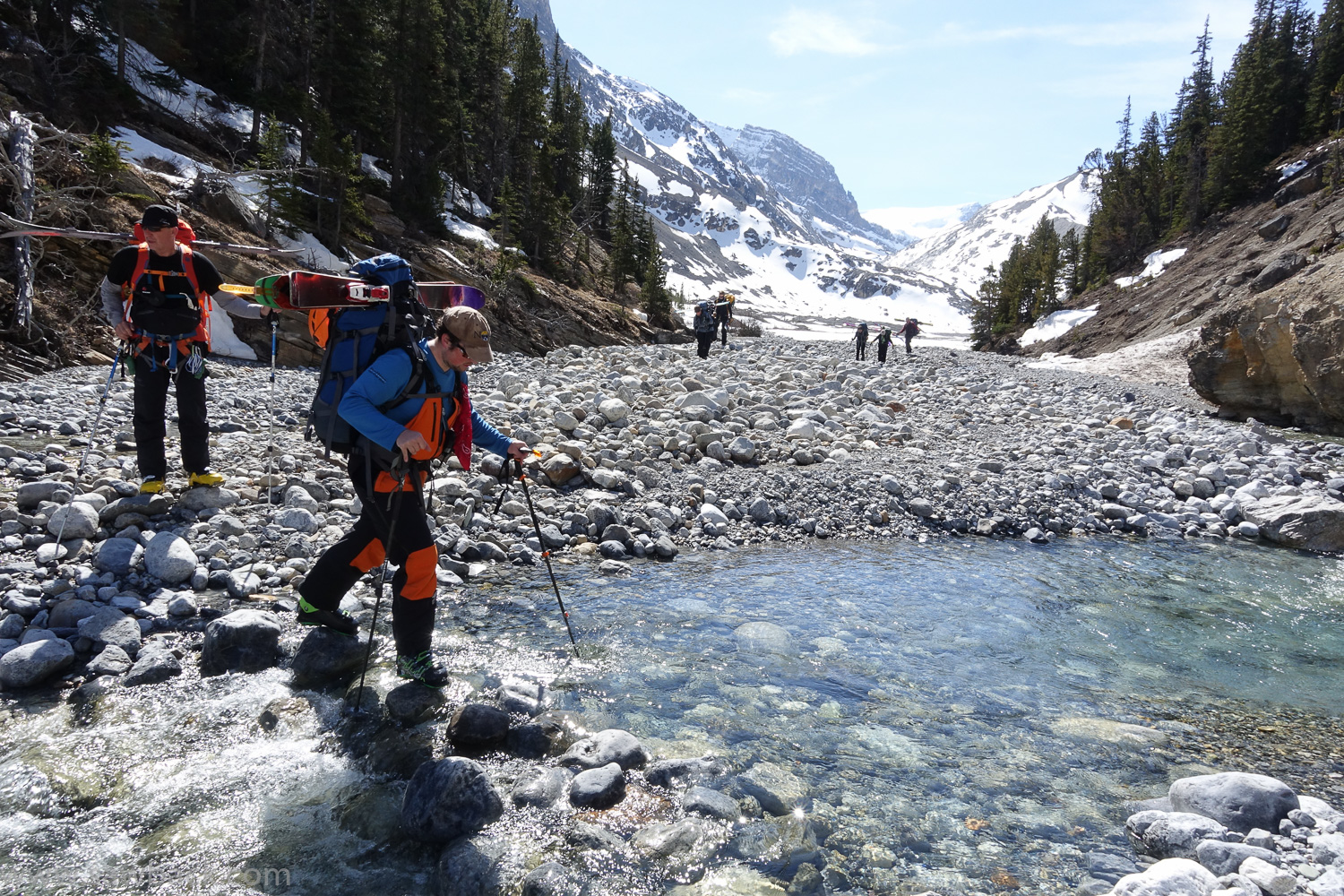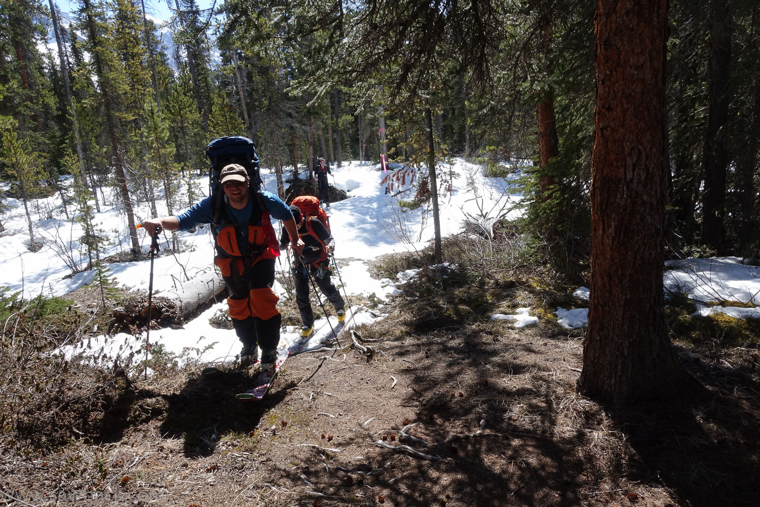 The access to Bow Hut is still in fairly good condition with a handful of spots requiring skis off. The route between the Peyto Lake trailhead and the Peyto Glacier however is in fair to poor condition with lots of sections of hiking and hunting for snow patches. Particularly the sections below the moraine and in the woods below the highway are a bit of a drag right now.