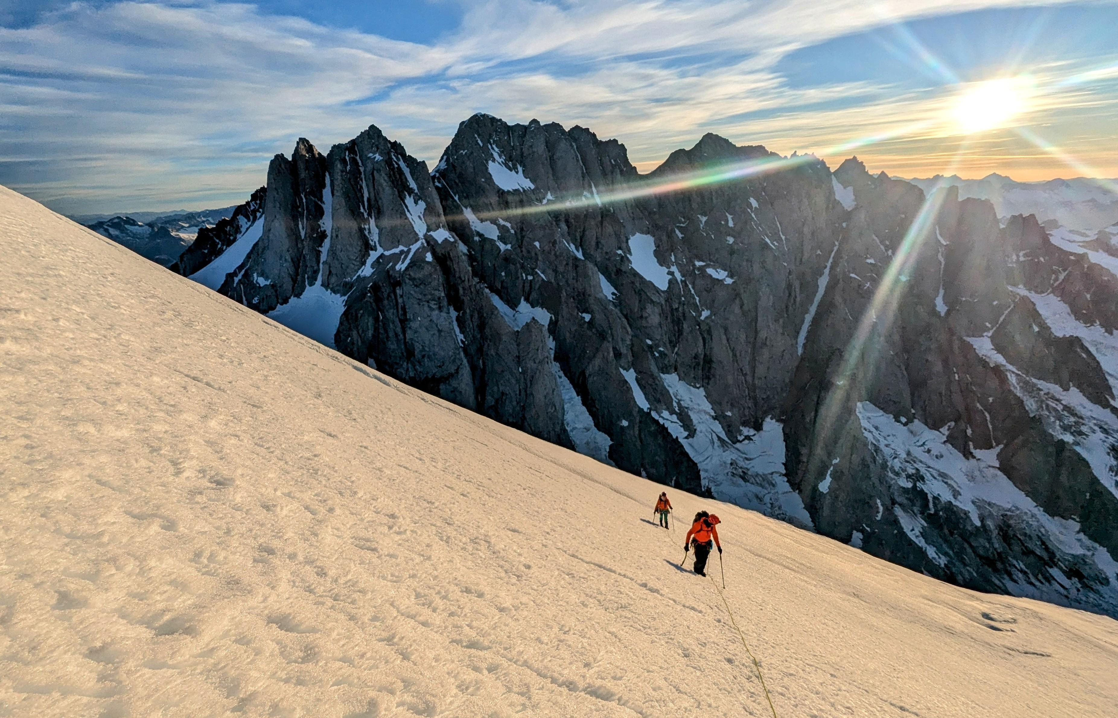 The overall conditions in the Waddington range were different than anticipated. Below 2800m glacier travel was challenging with open crevasses, minimal bridge options, and challenging bergshrund crossing. Much more reminiscent of mid summer conditions. Above 2800m there was much more remaining winter snow and conditions resembling to early summer with well covered snow bridge, passable bergshrunds, but also lingering avalanche problems and poor punchy walking snow surfaces. Perhaps this is due to a substantial snowstorm that swept the province in mid July. Perhaps this is also related to climate change affecting the lower mountain conditions more that the upper mountain. Either way, it makes planning an ascent of this nature more problematic. The final tower offered super interesting mix snow, ice, and rock climbing with good protection in the 5.8/M4/WI 3+ range. South facing alpine rock routes on Combatant, Tiedemann, and Asperity apear to be generally snow free from a distance.