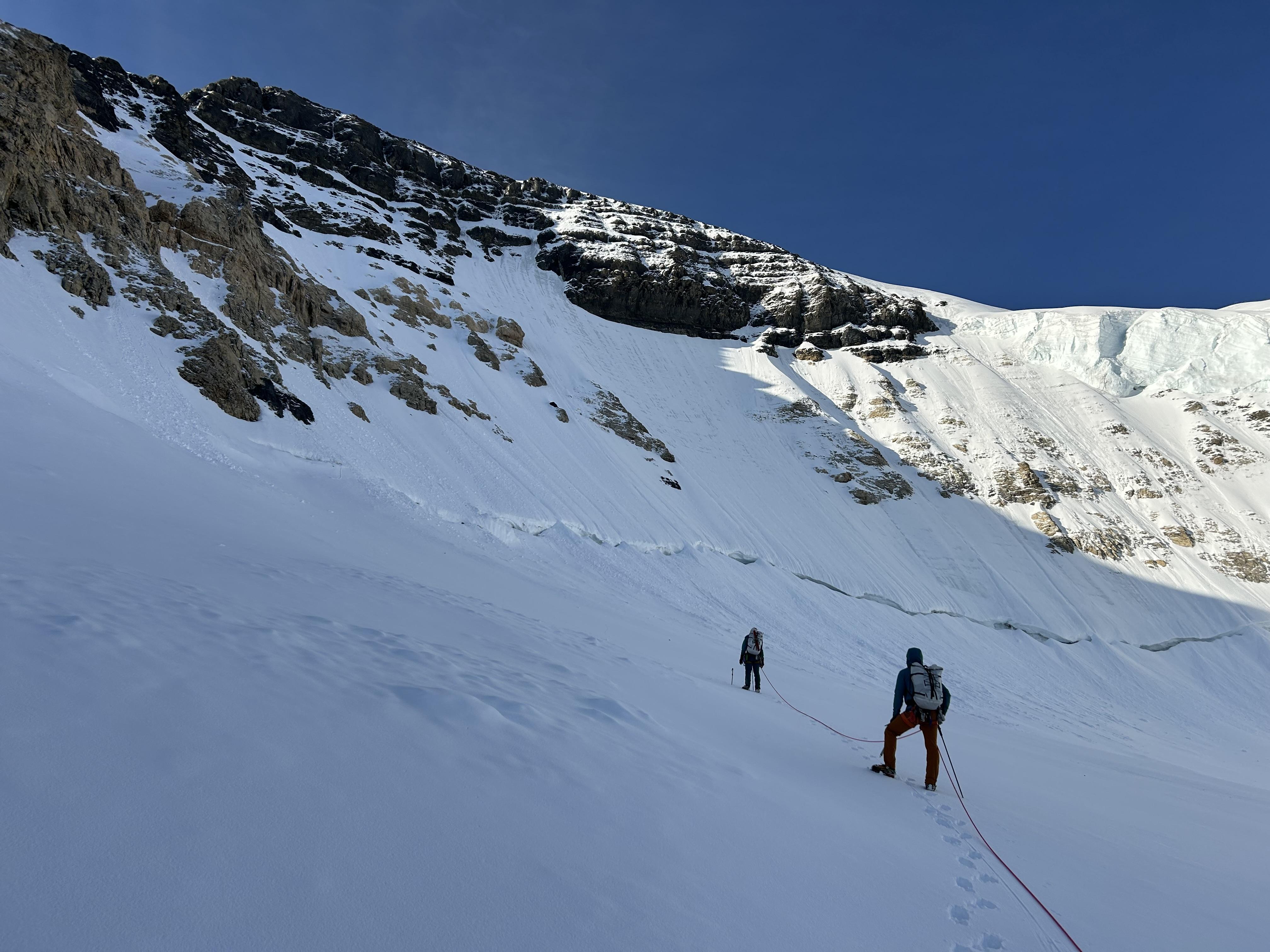 Great day on the N. Face bypass yesterday with Hamish and Kathy. We approached via the N. Glacier using the ledges and found straight forward travel up to the N. Face basin. Clear skies overnight and cool temps made for fast travel on a supportive crust and some hard work kicking steps up the bypass. The snow slope at the base of the black band has receded significantly adding an additional 10m of unprotected downslopy climbing to gain the ledge that leads to the Scottish gulley. There is an option to gain the ledge via a corner feature on the right and it is likely a better alternative. The Scottish gulley had ice/snice the entire length and the remaining ridge travel to the summit was relatively straight forward. We descend via the ramp route (getting steeper every year) with and easy crossing of the bergschrund and good steps. A great refreeze and a cool NE wind kept things locked in and we observed no natural avalanche activity or rockfall. A rare occurrence for July in comparison to the past few summer seasons. Photos of the N. Face basin, Scottish gulley, Silverhorn, Lingering Serac on Hourglass icefall and N. Face bypass slopes.
