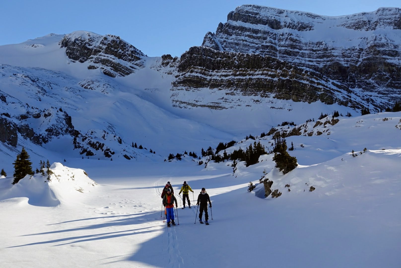 I spent the day ski touring in behind Crowfoot Peak today. A very cold start to the day (-26°) but after busting through the inversion (where temps climbed to -8°C) it proved to be a fine day with clear skies and sunshine. Mind you, we mainly saw the sun from a safe distance in the shaded valleys.
