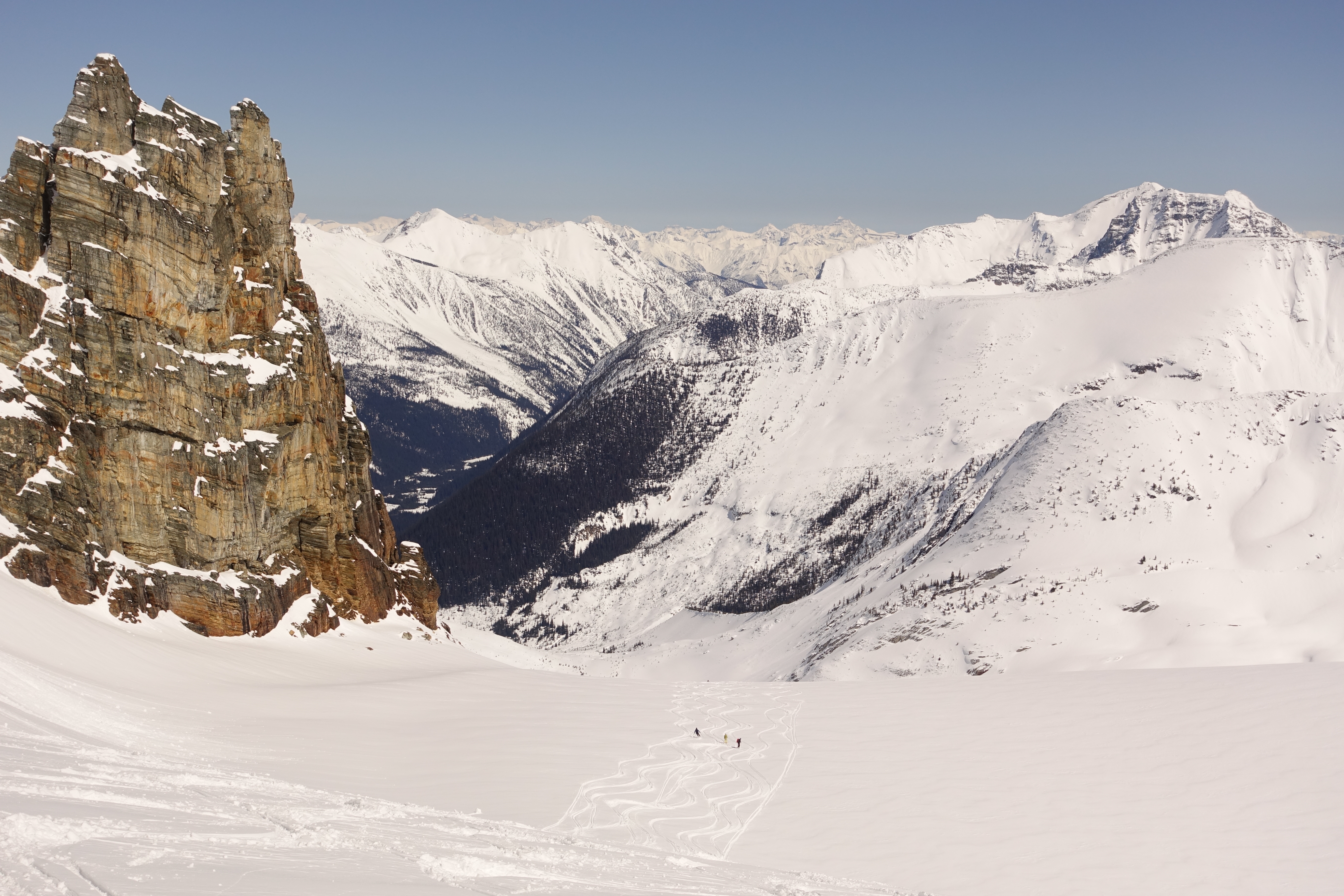 It was a truly amazing week for weather and skiing, beginning with four days of dry April powder on Sorcerer's abundant NW to NE terrain. Early on there was moderate avalanche hazard from isolated wind loading of the 20 cm new snow that greeted us on our arrival but this settled out quickly.